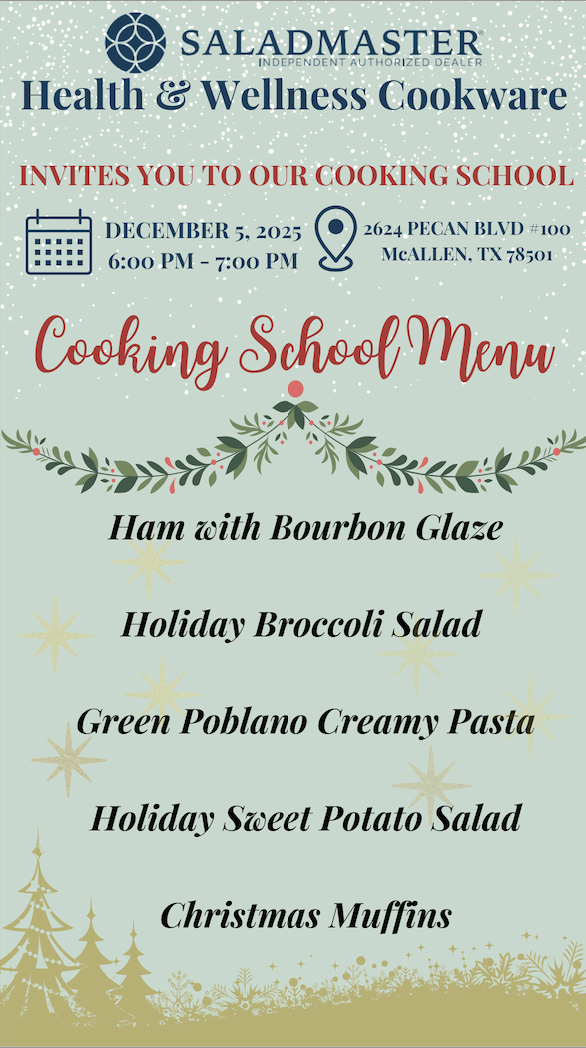 As a Valued Saladmaster Owner of Health & Wellness Cookware, you have access to our Cooking Classes as part of your Lifetime Membership to our Exclusive Content & Specials! We will be posting our menu as the date approaches.