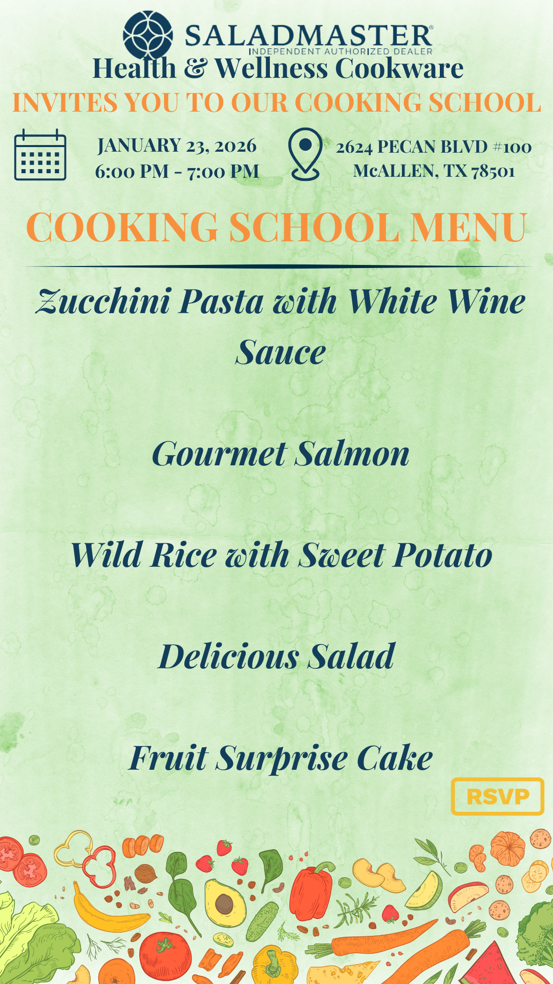 As a Valued Saladmaster Owner of Health & Wellness Cookware, you have access to our Cooking Classes as part of your Lifetime Membership to our Exclusive Content & Specials! We will be posting our menu as the date approaches.