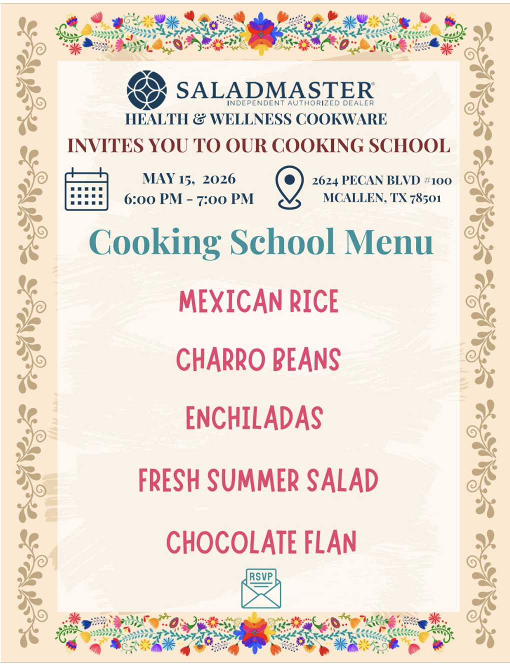 As a Valued Saladmaster Owner of Health & Wellness Cookware, you have access to our Cooking Classes as part of your Lifetime Membership to our Exclusive Content & Specials! We will be posting our menu as the date approaches.